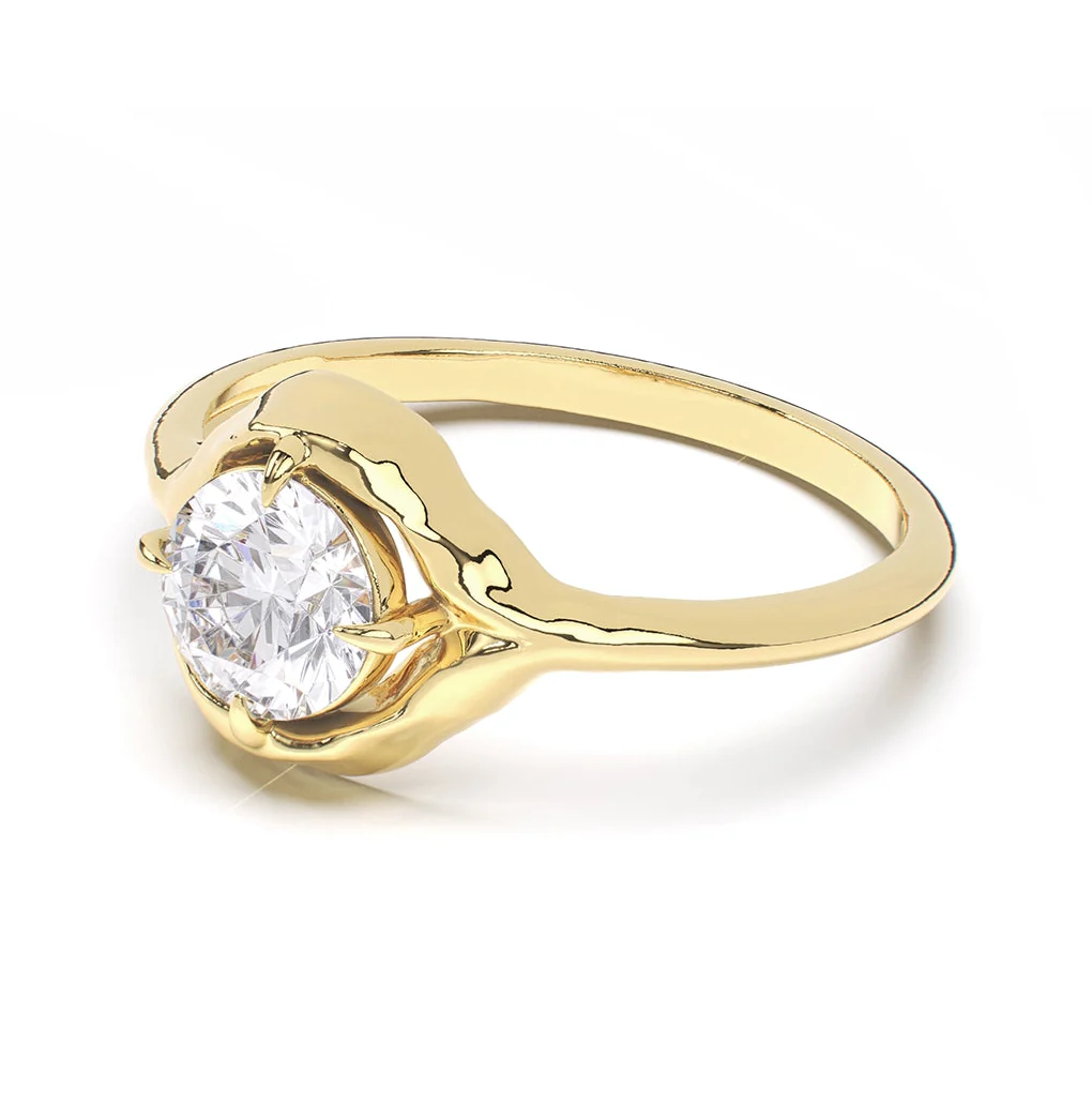 Inspired by the quiet forms of nature, this design frames a round diamond within fluid curves of gold. Each line flows with intention - soft, balanced, and enduring. A modern solitaire that feels both elemental and refined, crafted to be worn and cherished across time.