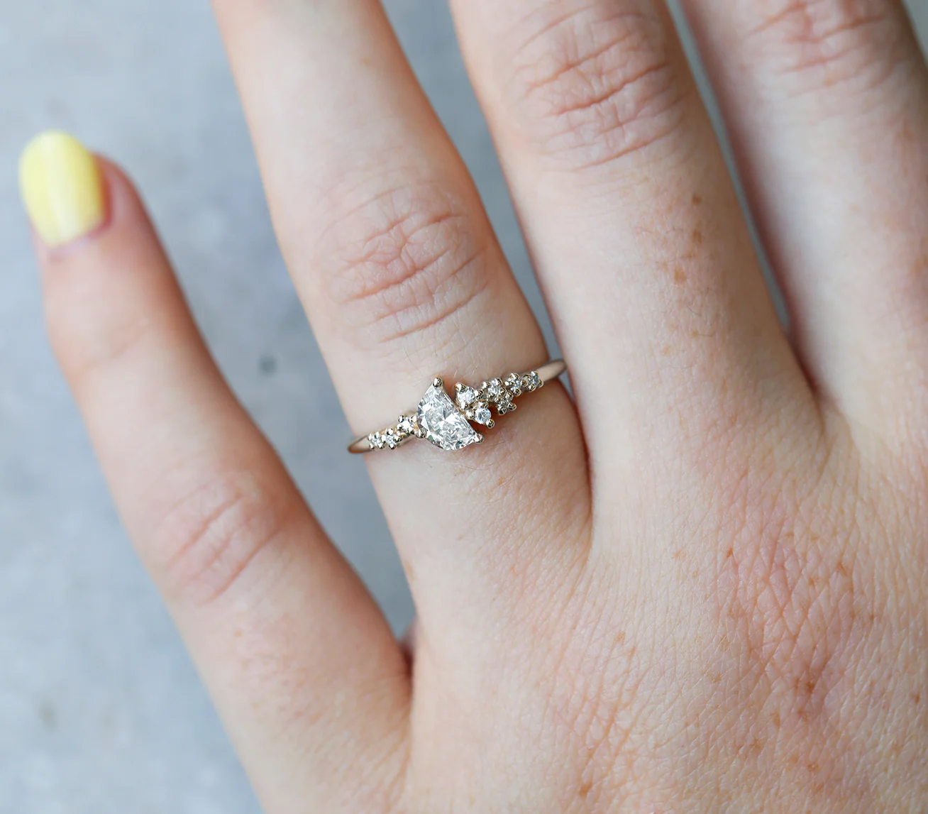 Designed for the modern bride to mirror the elegance of stars in the night sky, our Stellar ring is adorned with nine diamonds and set with a crescent cut white diamond. This asymmetrical beauty is perfect for that big moment.